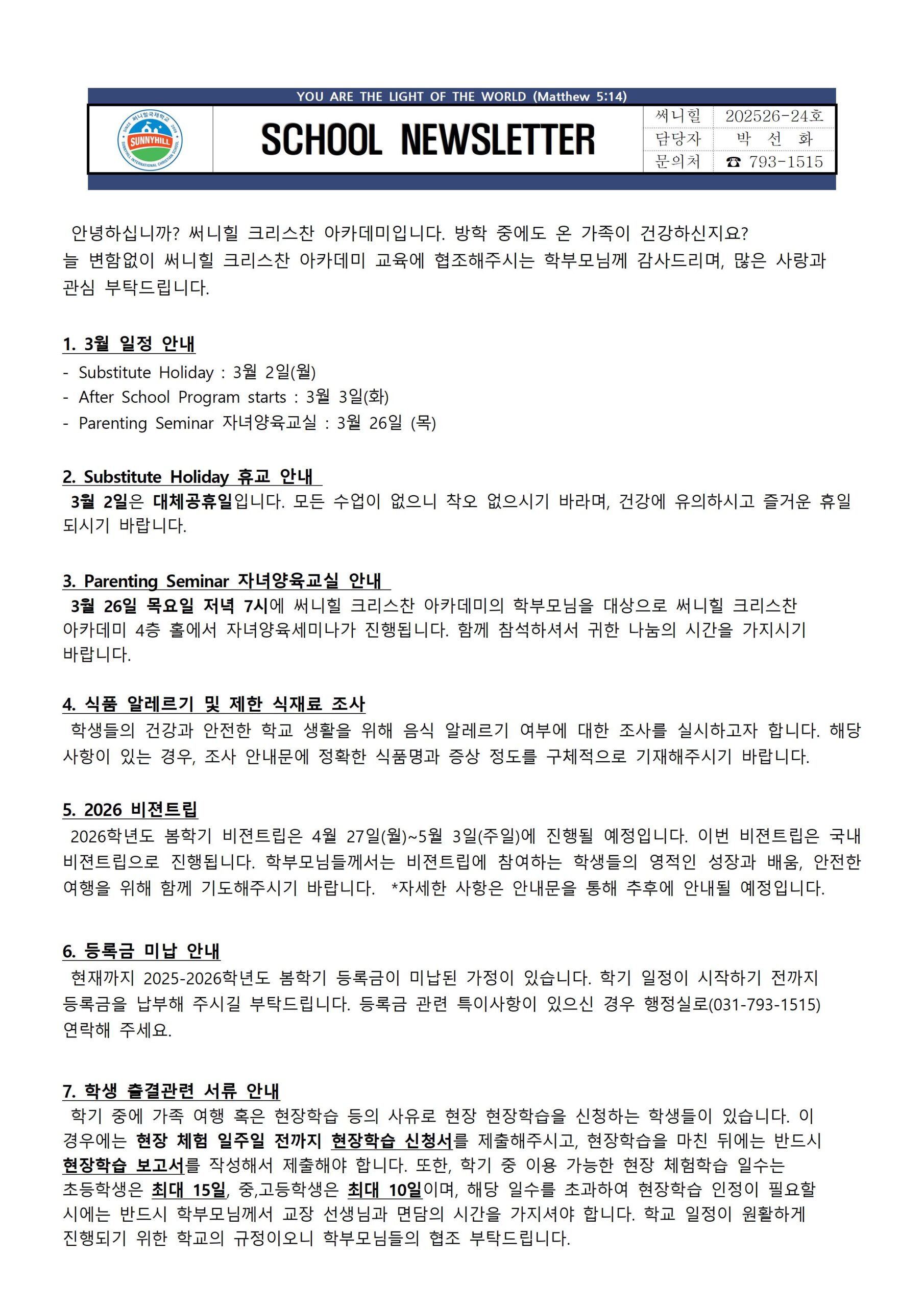March 6, School News 가정통신문