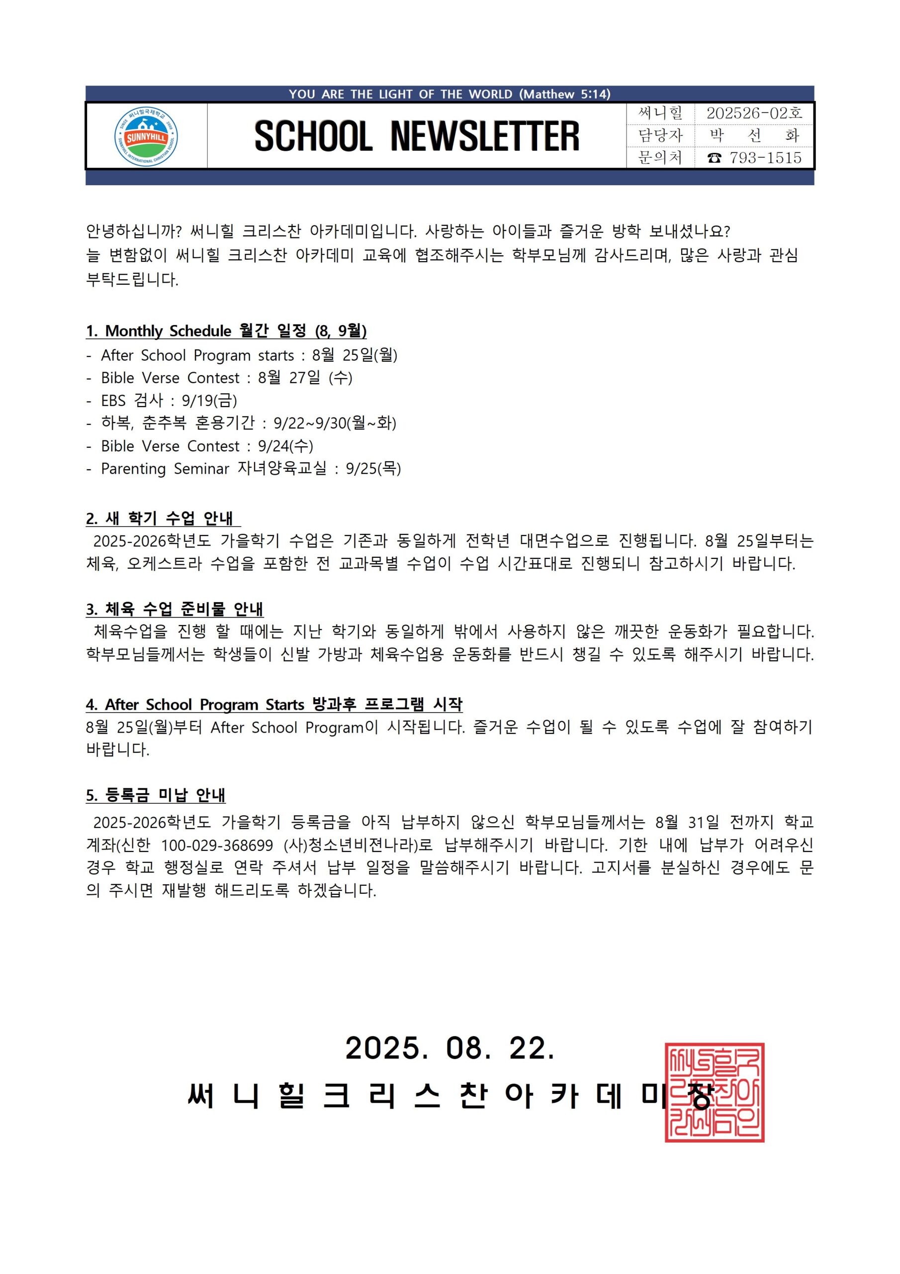 August 22, School News 가정통신문